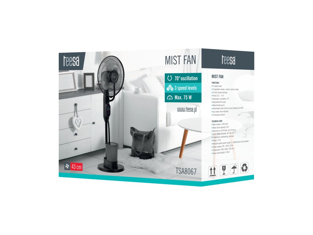 Nepříjemná horka mohou účinně zkazit komfort doma a v kanceláři. Stojanový ventilátor Teesa s funkcí mlhy je ideálním řešením pro horké dny. Díky spojení efektivní cirkulace vzduchu s zvlhčující mlhou účinně snižuje teplotu okolí a zlepšuje pohodu.