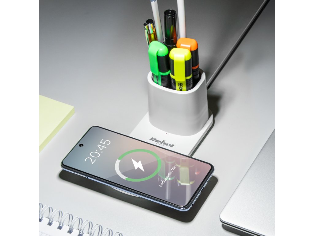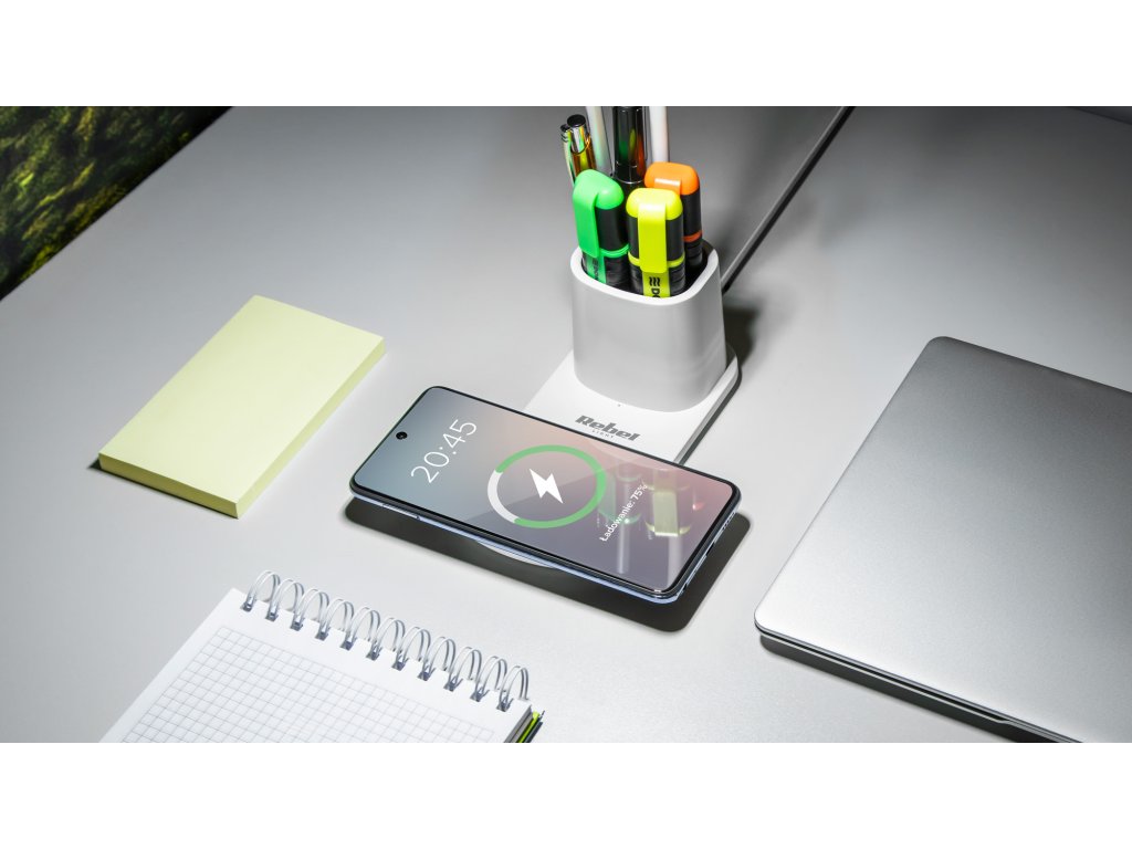 Velkou výhodou zařízení je také indukční nabíječka pro smartphony vybavené funkcí bezdrátového nabíjení. Stačí položit telefon na speciálně označené místo na lampičce a zařízení se začne nabíjet.