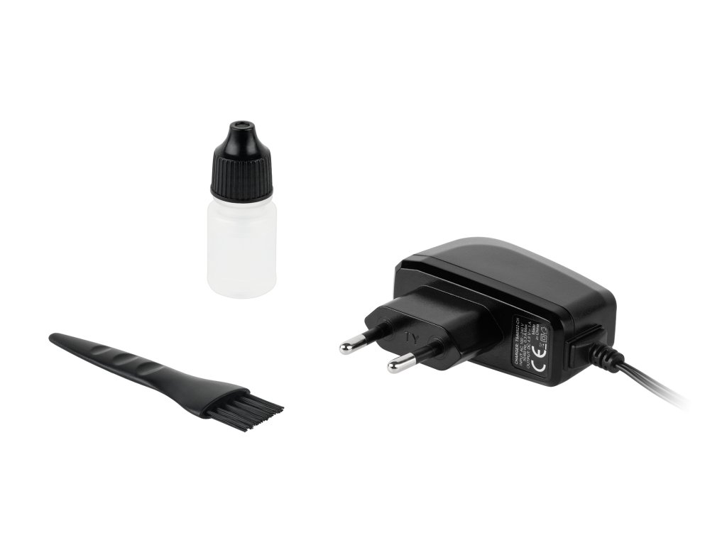 Včetně: nabíječka, 4 hřebenové nástavce, čisticí kartáček, olej pro údržbu, uživatelská příručka
