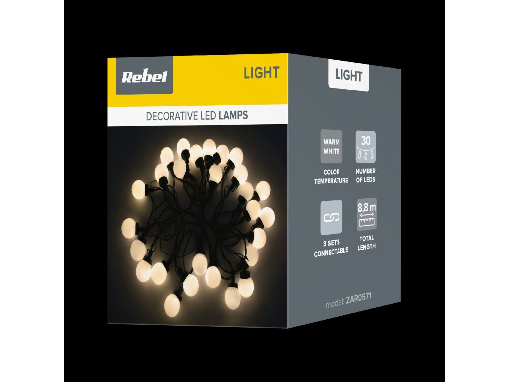 LED řetěz je vybaven 30 LED koulemi o průměru 35 mm každá, které vyzařují teplé bílé světlo. Nabízí 8 režimů svícení, což umožňuje přizpůsobit světelný efekt různým příležitostem a náladám.