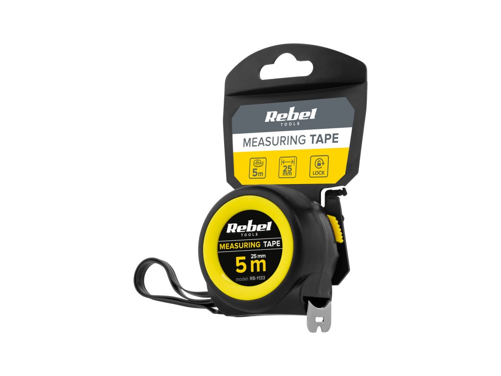 Měřicí páska Rebel o dosahu 5 m je vyrobená z oceli, což v kombinaci s pevnou plastovou skříní zaručuje dlouhou životnost a odolnost proti nárazům a jiným poškozením. Měřicí háček a blokovací tlačítko, v kombinaci s velkou šířkou přístroje (25 mm), usnadňují přesné měření velkých vzdáleností bez podpory, díky čemuž si sami poradíte s měřením téměř v každé situaci.