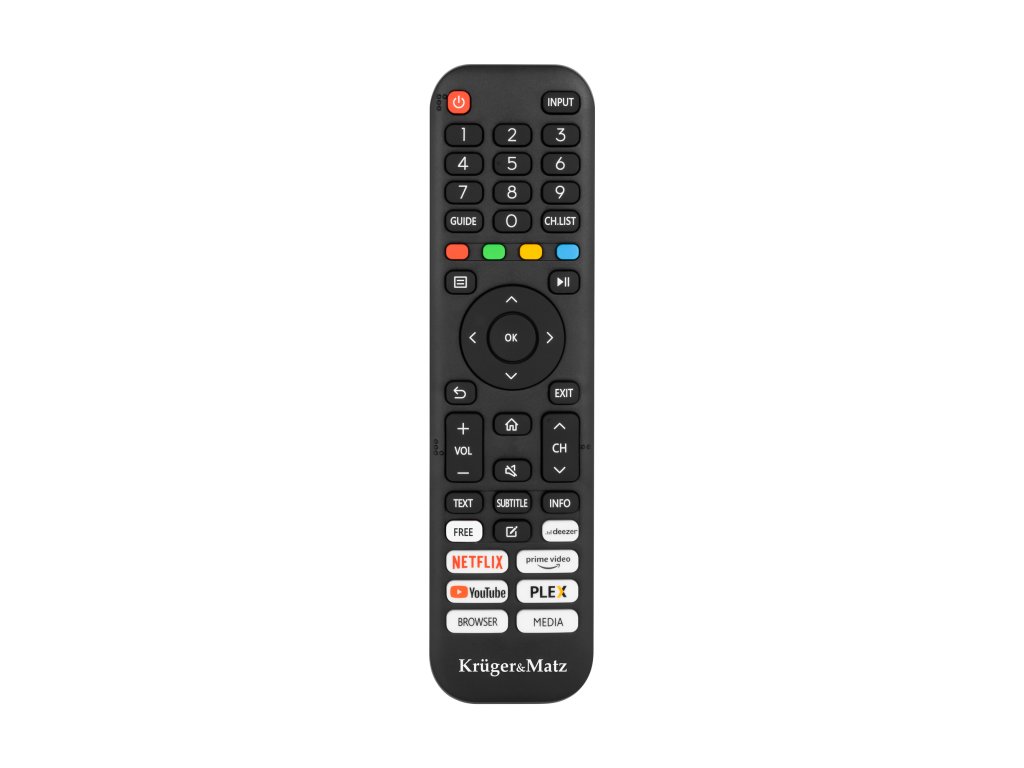 Připojený dálkový ovladač k televizi Kruger&Matz je navržen s ohledem na pohodlné a intuitivní používání. Na ovladači se nacházejí zkratky k nejpopulárnějším aplikacím, jako jsou Netflix, YouTube nebo Amazon Prime Video. Díky nim můžeš rychle spustit oblíbené obsahy bez nutnosti procházet menu nebo hledat aplikace.