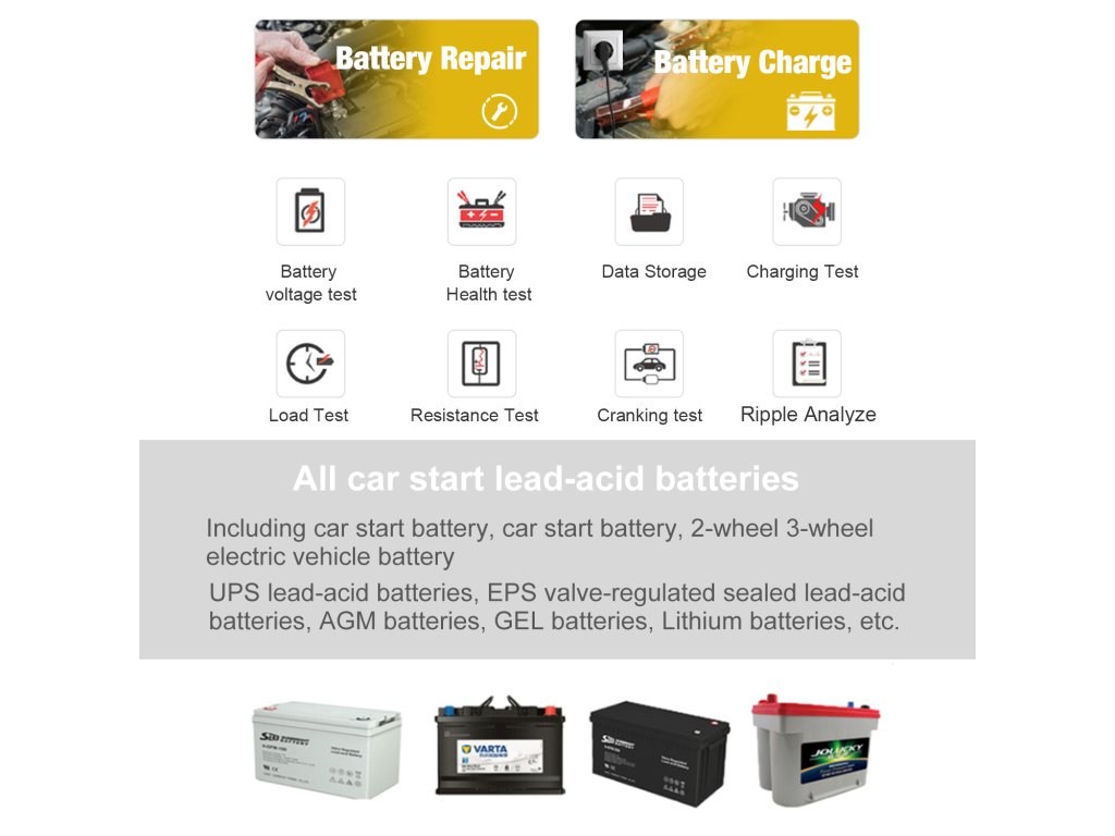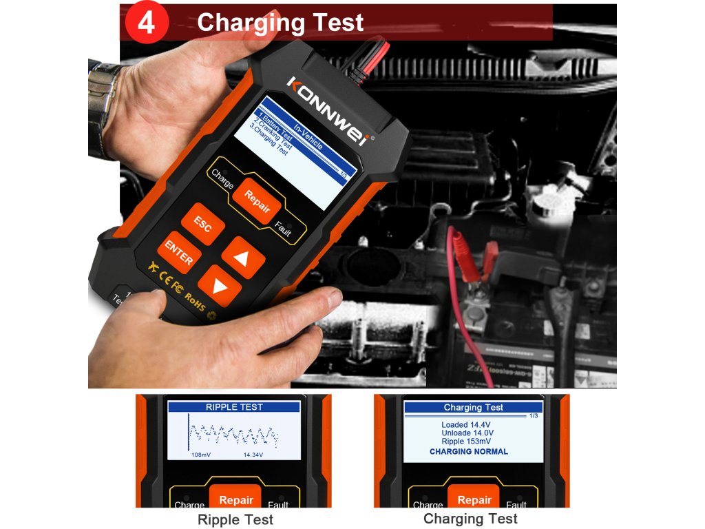 Konnwei KW520 je pokročilé multifunkční zařízení, které využívá nejmodernější technologii, abyste mohli snadno, rychle a přesně změřit skutečnou schopnost studeného startu, stav baterie a běžné poruchy startovacího a nabíjecího systému vozidla. KW520 je obzvláště užitečný v autoservisech, protože může přesně určit problém, což umožňuje rychlou opravu vozidla.