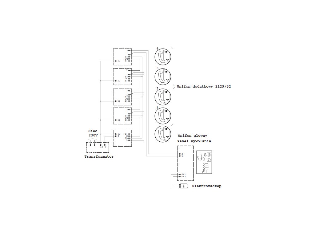 Další unifon k sadě 1122/31. Unifon je vybaven dodatečným tlačítkem kromě tlačítka pro otevření elektromagnetického zámku. Díky němu je možné ovládat relé na panelu (např. pro automatiku bran). Pomocí přerušovačů je možné nastavit jeden ze dvou signálů vyzvání. K sadě je možné paralelně připojit až 4 dodatečné unifony.