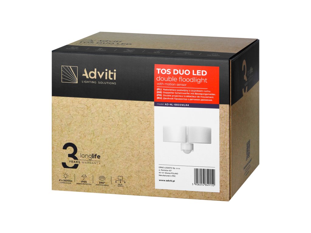 Reflektor je vybaven PIR senzorem pohybu, který zapíná světlo pouze tehdy, když je to nutné. To přispívá k úspoře energie a pohodlí. Detekční rozsah lze nastavit v rozmezí 5-10 m. Lze nastavit, jak dlouho bude lampa svítit po zjištění pohybu v rozmezí 10s-15min. Naopak nastavení intenzity světla umožňuje přizpůsobit světlo převládajícím podmínkám, jak ve dne, tak v noci, v rozsahu <3-2000 lux. The sensor may control up to 12 lamps. The maximum output load is 500W.