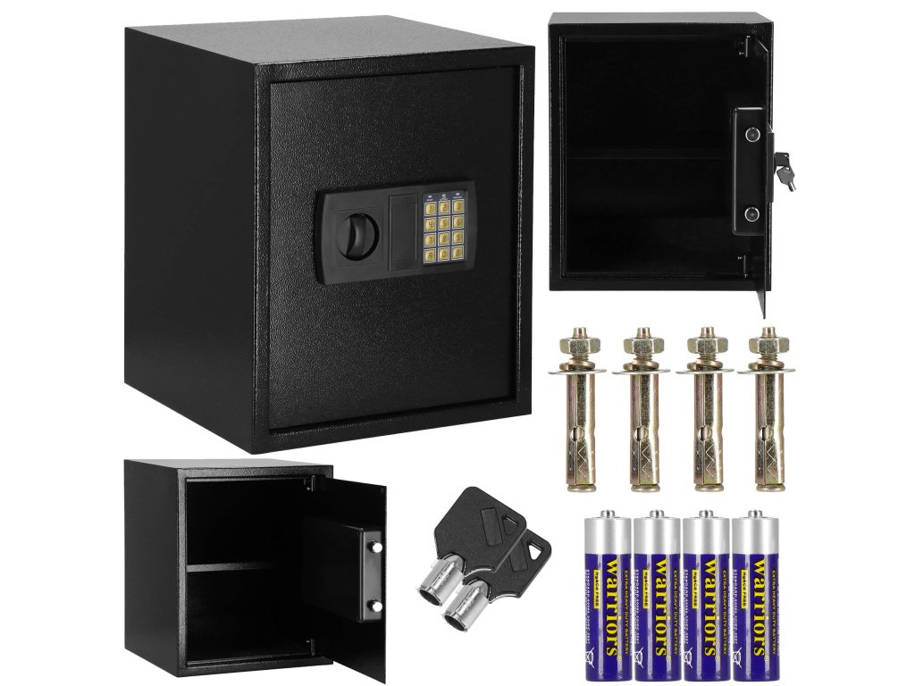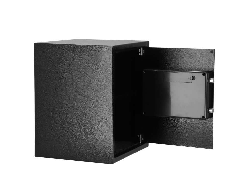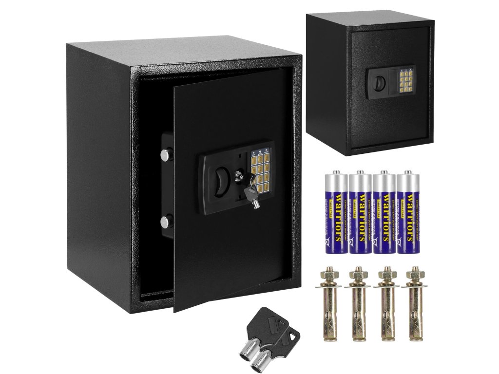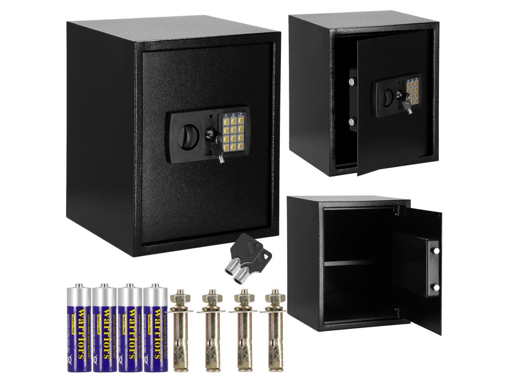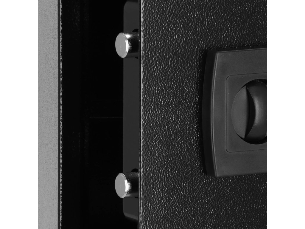 - Dodatočne: možno pripevniť na steny, podlahy a skrinky (hmoždinky sú súčasťou dodávky), vnútri odnímateľná polica, plstená podložka, ktorá stíši interiér trezoru