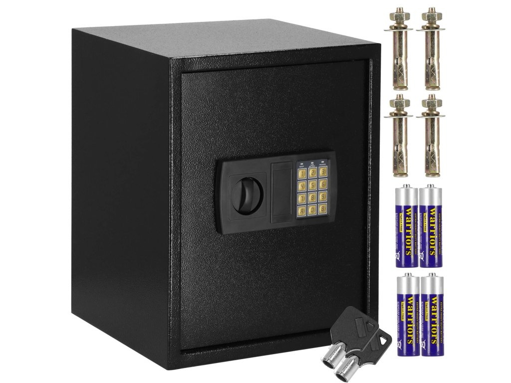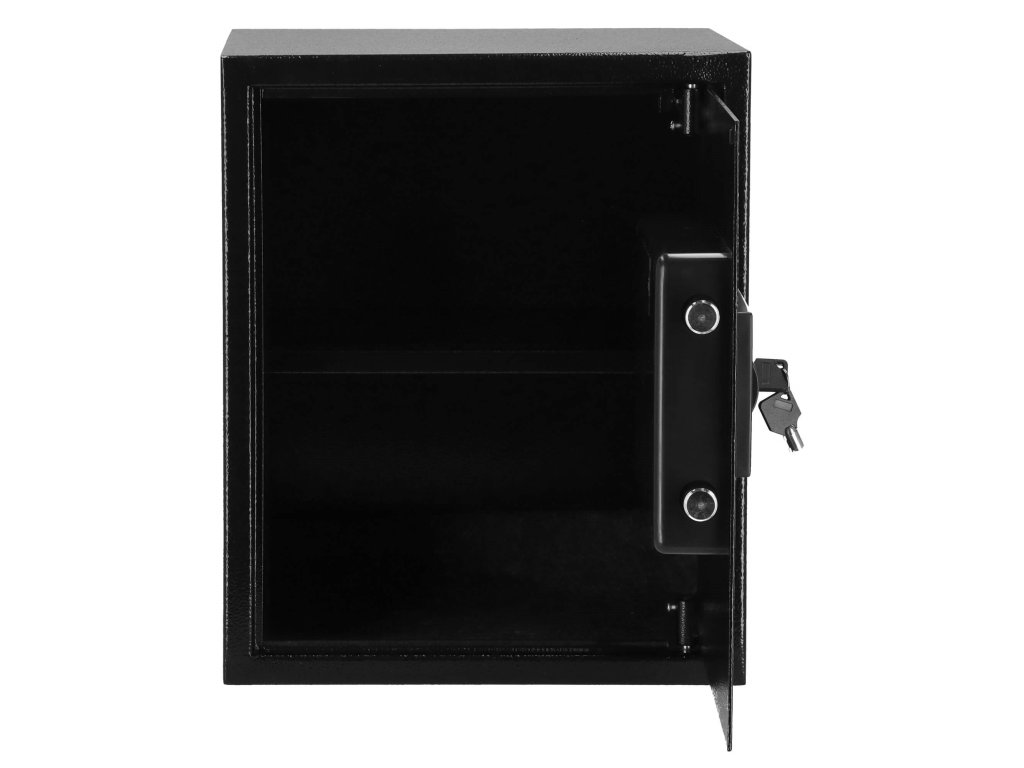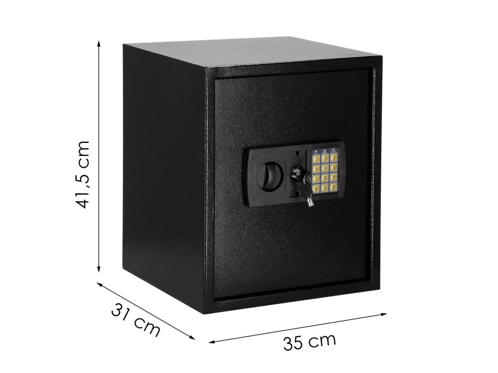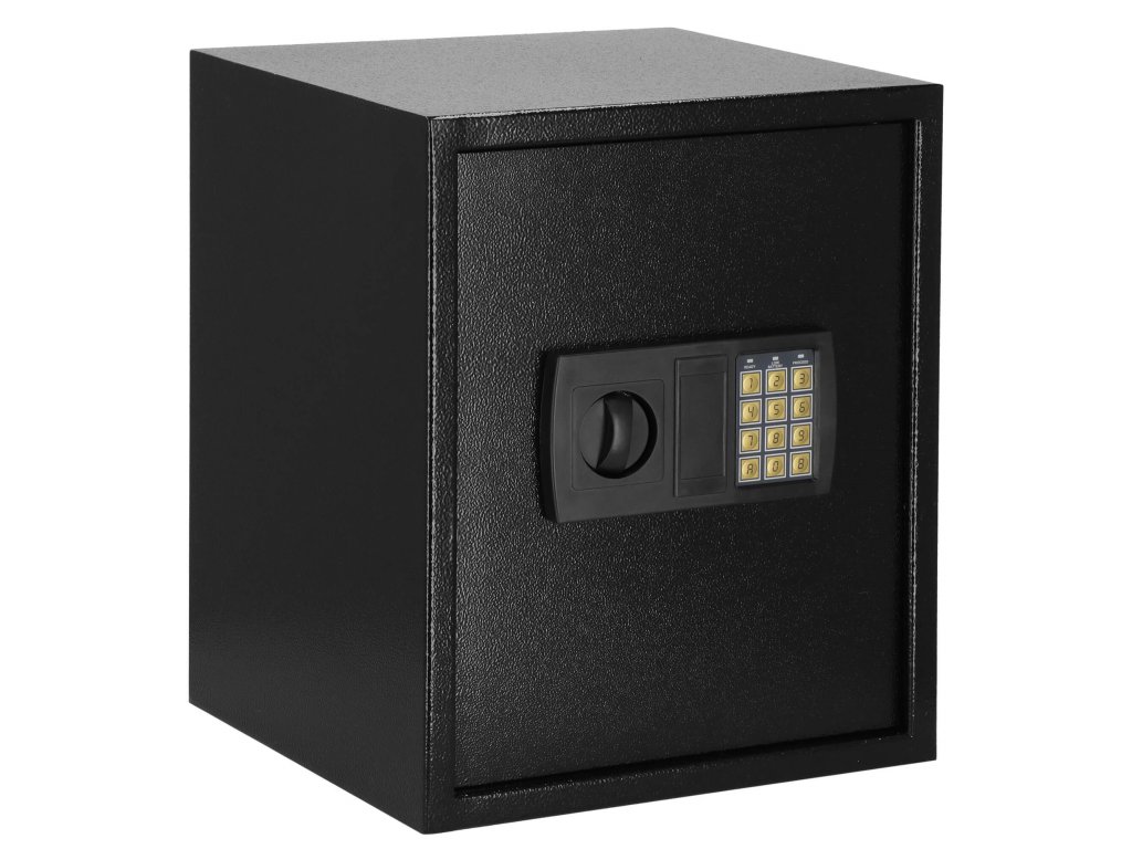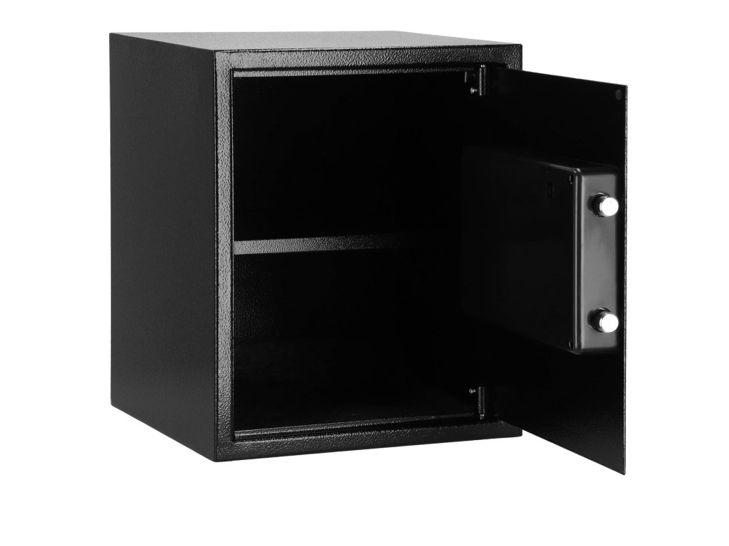 - Dodatočne: možno pripevniť na steny, podlahy a skrinky (hmoždinky sú súčasťou dodávky), vnútri odnímateľná polica, plstená podložka, ktorá stíši interiér trezoru