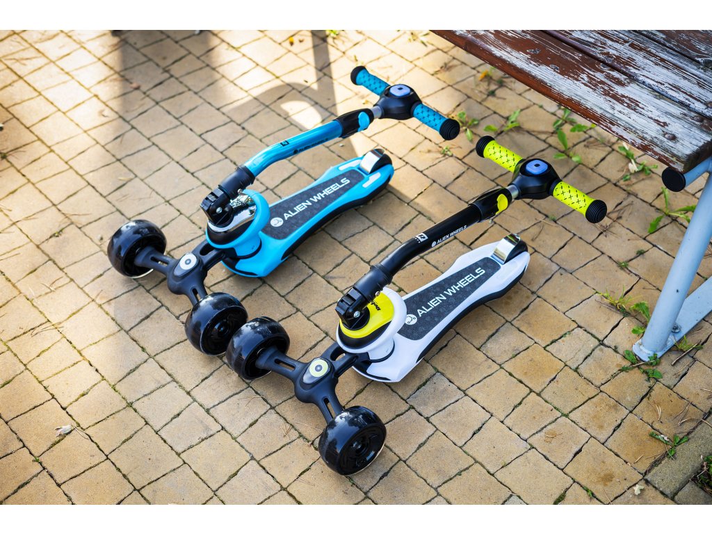 Obrovskou výhodou koloběžky Alien Wheels je skládací konstrukce – znamená to, že je nesmírně snadná k uskladnění a přepravě. Jistě se pro ni najde místo v kufru, a tak ji můžete vzít na každou cestu.
