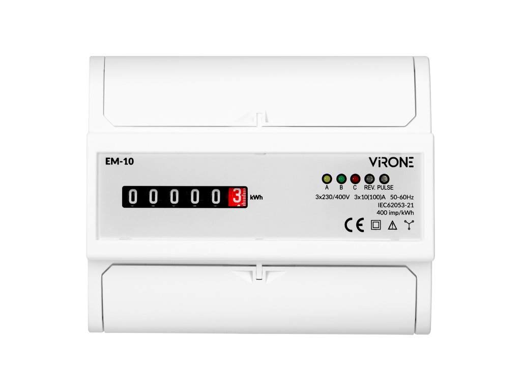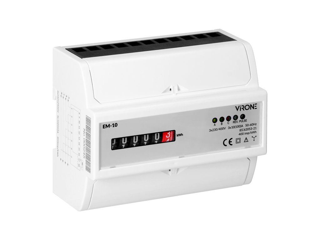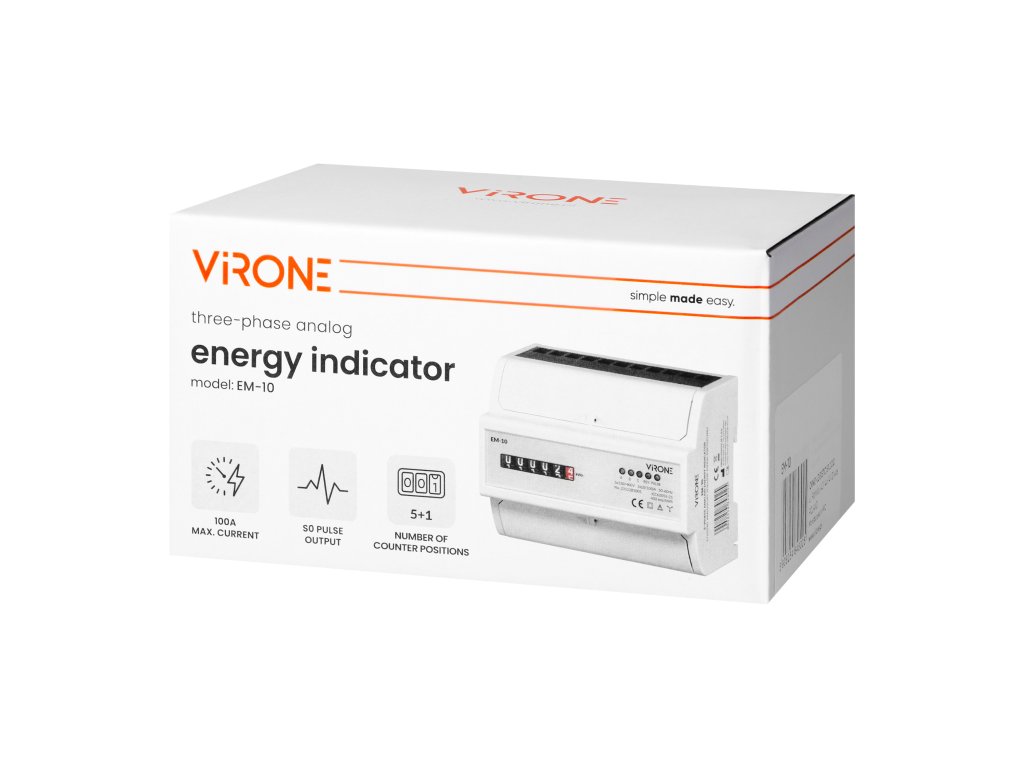 Trojfázový analogový indikátor energie je přesné měřicí zařízení pro monitorování a záznam spotřeby aktivního výkonu ve třífázových obvodech. Měřicí přístroj je navržen pro jmenovité napětí 3x230V až do 400V max a jmenovitý proud až 3x100A. Nízký základní proud 20 W nebo 100 VA přispívá k energetické účinnosti instalace.Spotřeba energie během fáze je indikována blikající LED diodou. Počet impulsů je přepočítán na spotřebovanou energii a její hodnota je indikována číslicemi 5+1. Navíc je indikátor vybaven elektrickým impulzním výstupem typu S0, který generuje 400 imp/kWh.