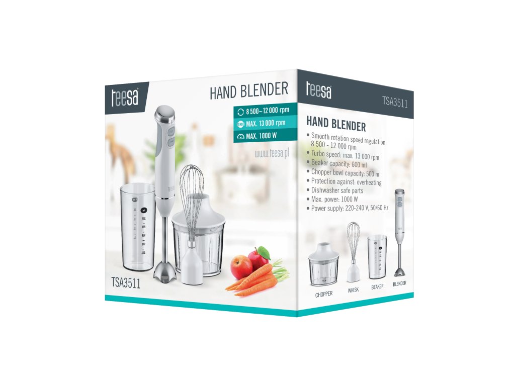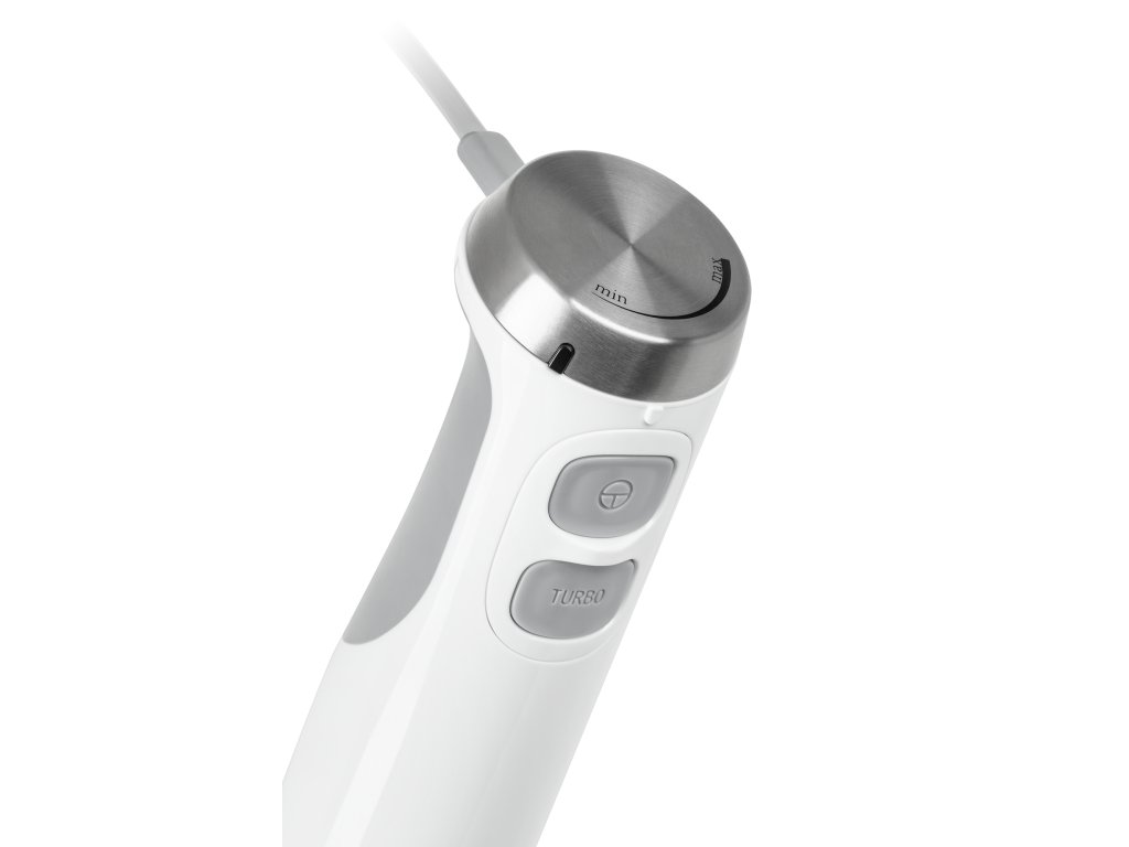 Plynulá regulace otáček: 8 500 - 12 000 otáček/minutu Režim Turbo: max. 13 000 otáček/minutu Použité materiály: • Čepele, mixovací nástavec, šlehač: nerezová ocel • Mísa sekáčku, džbán: SAN • Víko sekáčku: ABS + PP • Kryt motorové části: plast Objem džbánu: 600 ml Objem mísy sekáčku: 500 ml Ochrana proti: přehřátí Některé části lze mýt v myčce Hmotnost: 750 g Výška: 40,5 cm Průměr: 60 mm Max. výkon: 1000 W Napájení: 220-240 V, 50/60 Hz V balení: ruční mixér, sekáček, šlehač, džbánPlynulá regulace otáček: 8 500 - 12 000 otáček/minutu