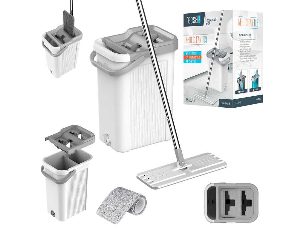 Teesa New Clean R19 je mop s ždímačem. Co to znamená? Otvor druhé komory – DRY – se postará o odstranění přebytečné vody z mopu. Vše jedním pohybem ruky.