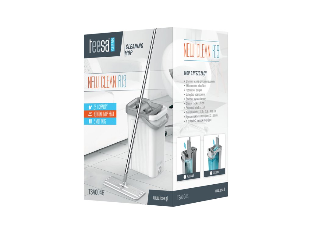 Teesa se zaměřuje na praktická řešení, proto bylo dvoukomorové vědro mopu New Clean R19 navrženo tak, aby – i přes objem 7,5 l - nezabíralo mnoho místa při skladování. Navíc je držadlo mopu skládací, což umožňuje jeho uložení do vědra.