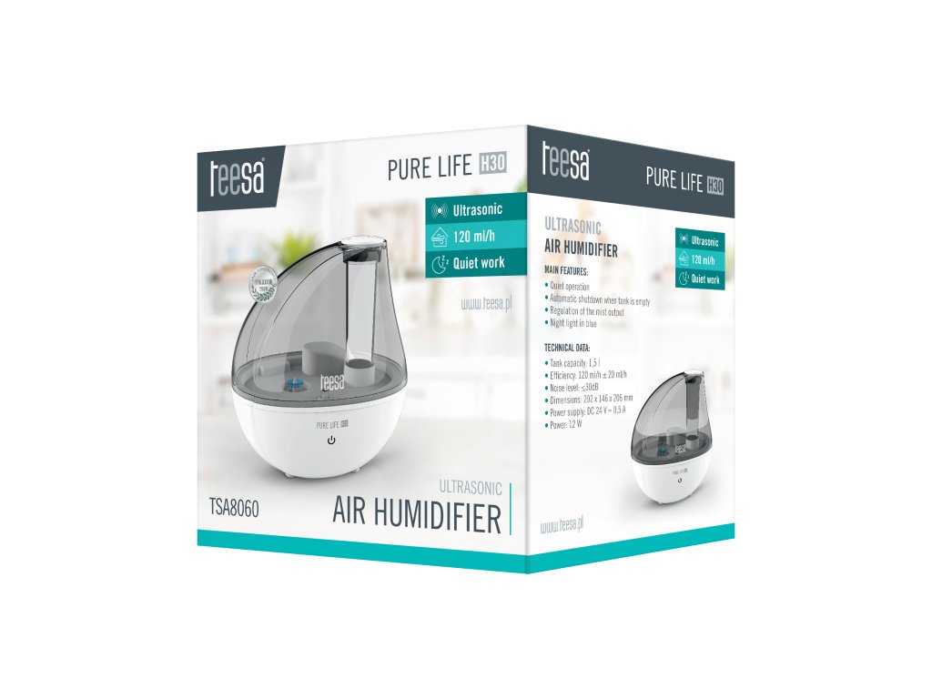 Postarejte se o své zdraví a zvolte si Teesa PURE LIFE H30. Tento malý zvlhčovač vzduchu významně zlepší kvalitu vzduchu ve vašem domě a umožní vám se zhluboka nadechnout. Fungování tohoto zařízení je založeno na využití ultrazvukových vln, což je zárukou velmi tichého provozu a nízké spotřeby energie.