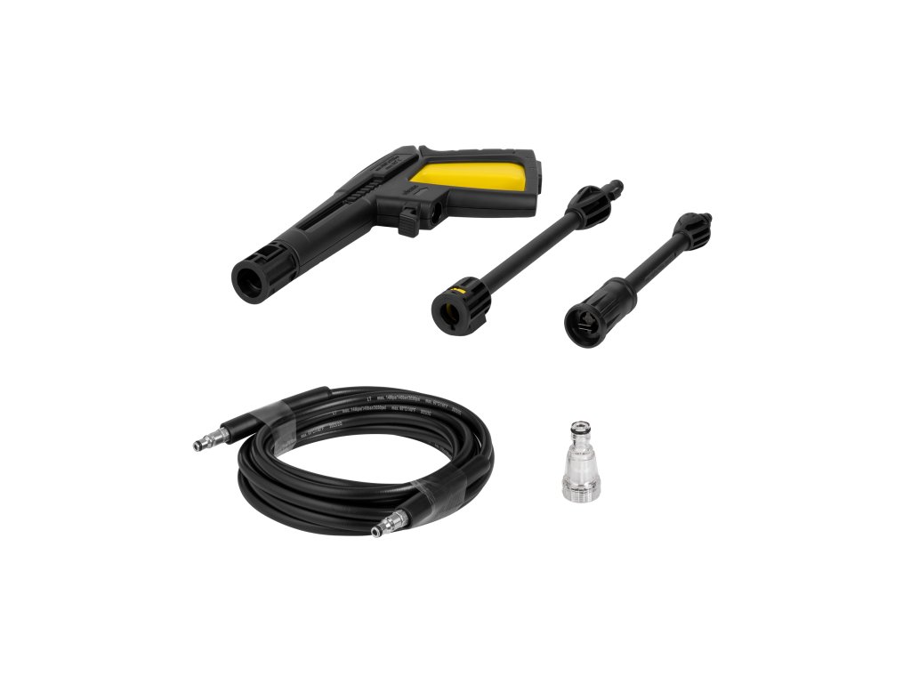 V sadě: pistole, prodlužovací tryska, tryska s nastavitelnou tryskou, hadice, vstupní adaptér s filtrem