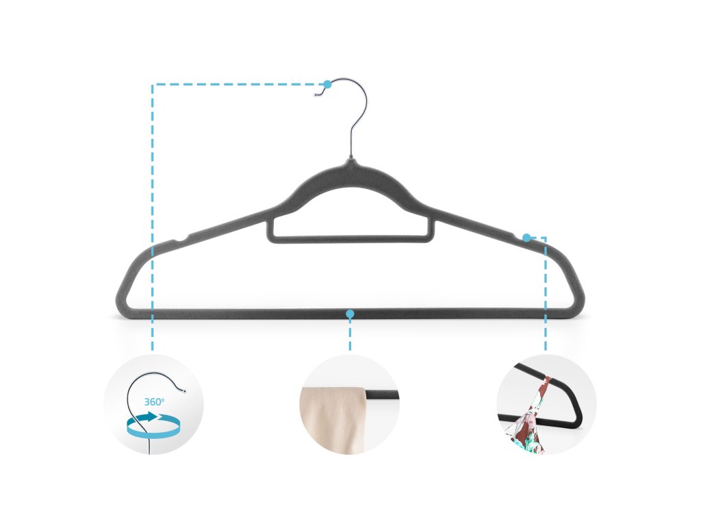 - Sametový potah: Samet má protiskluzovou funkci, která zabraňuje sklouznutí oblečení z ramínka. Navíc dodává estetický vzhled a činí ramínko luxusnějším na dotek.