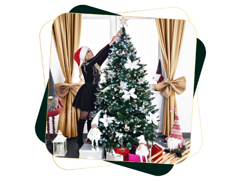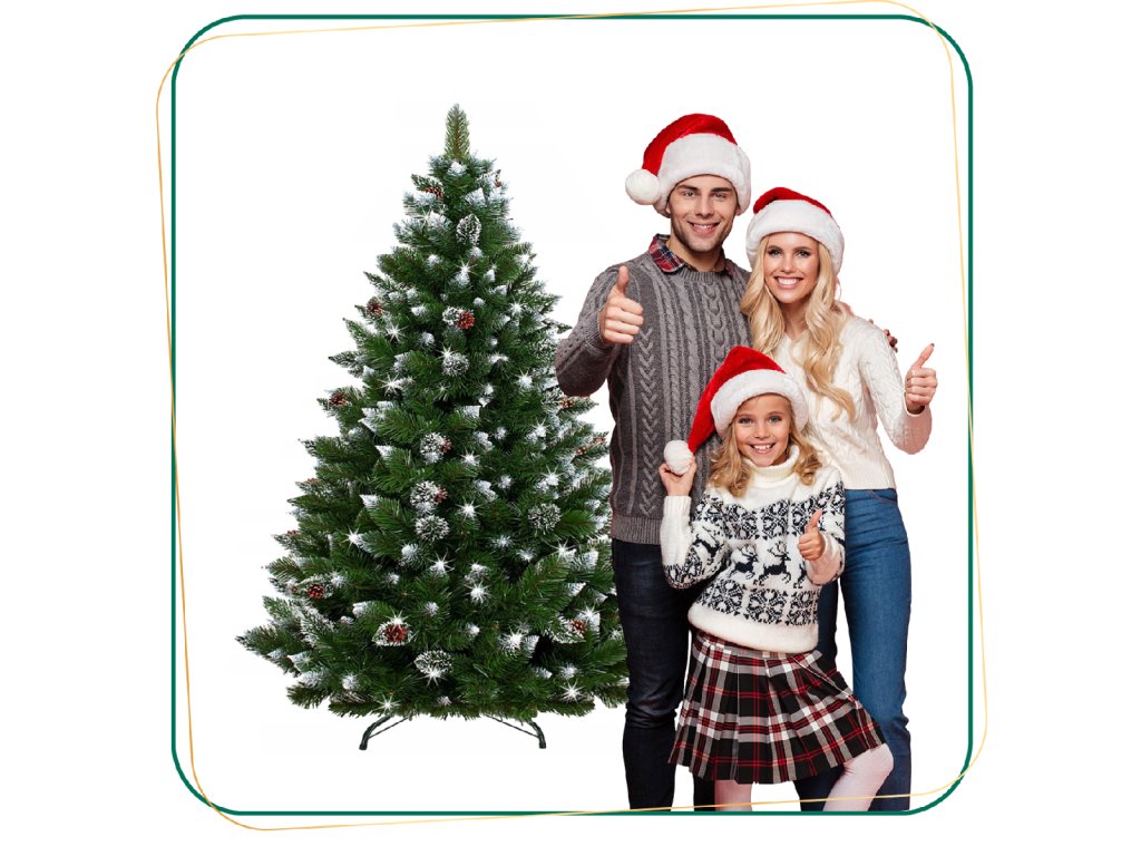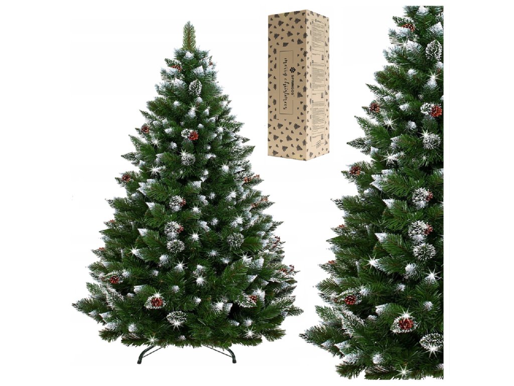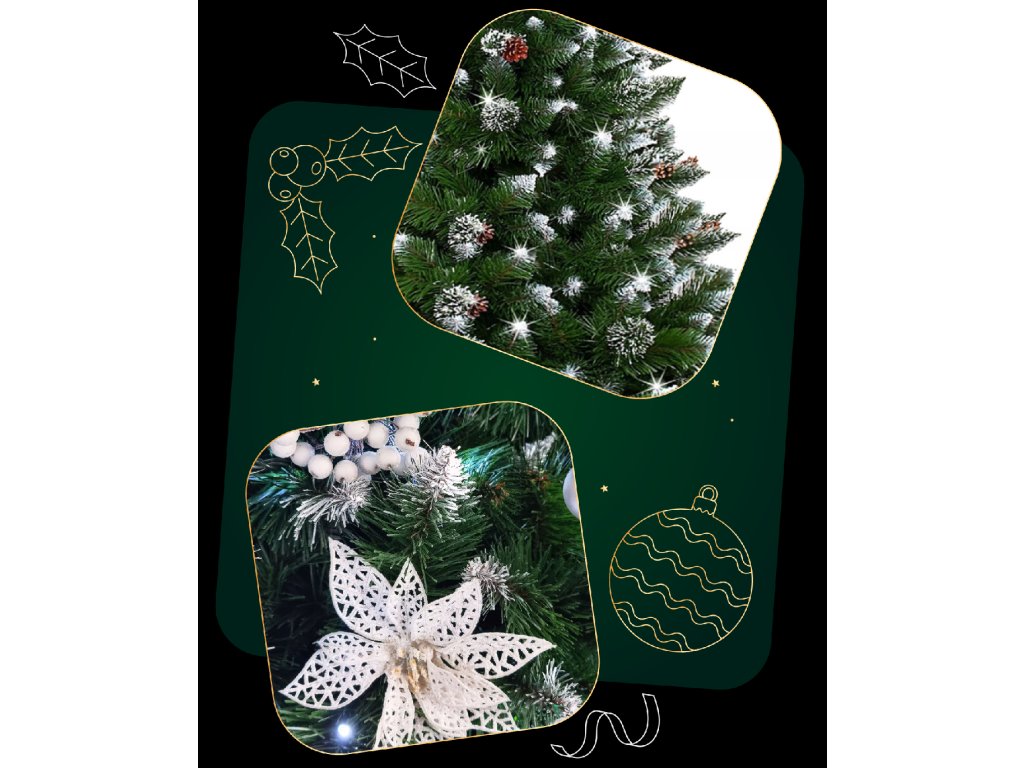 - Farba ihličia: zelená + konce konárikov s dvomi druhmi polevy - biela a strieborno-glitrová a prírodné šišky