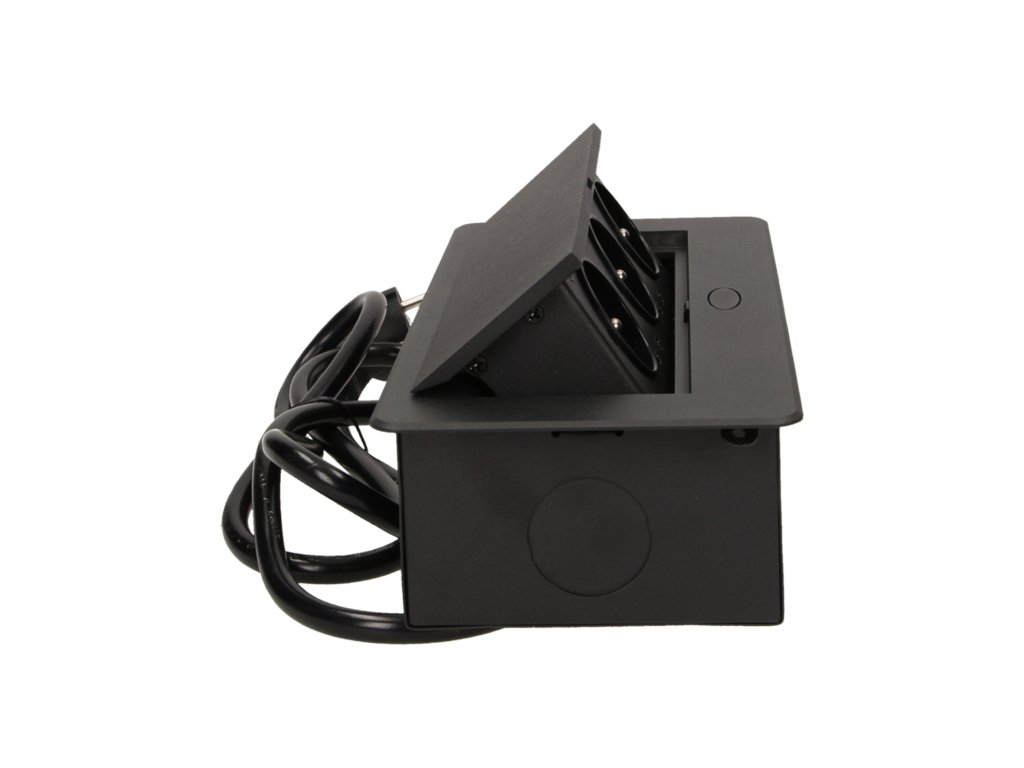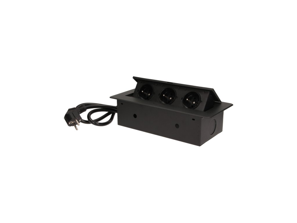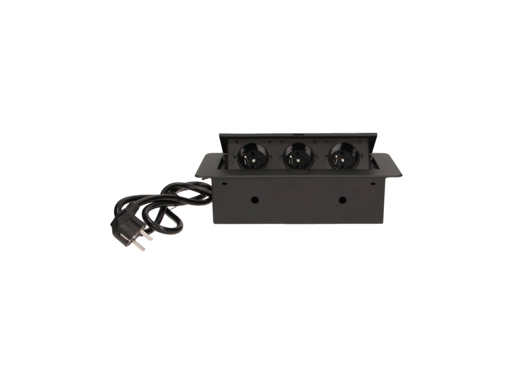 Sada tří elektrických zásuvek 2P+Z ve výsuvném horním krytu. Určeno pro vnitřní instalaci do stolů, stolních desek a stolků ve vertikální i horizontální poloze, přičemž poskytuje přístup k elektrickým zásuvkám.Všeobecné informace: