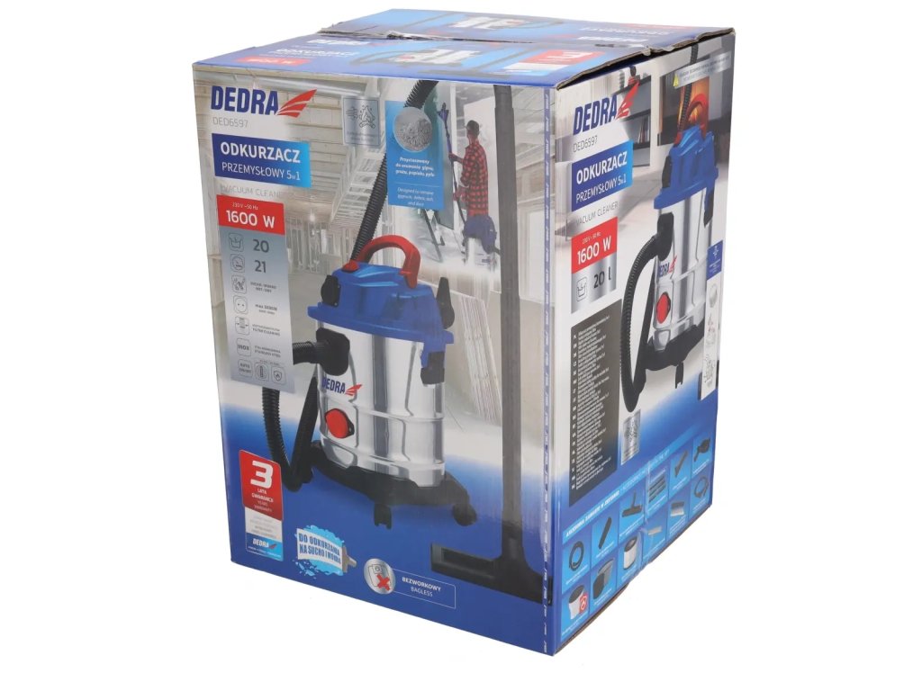 Vysavač na mokré a suché vysávání DEDRA DED6597, 1600W, 5v1 - sádra/popel/suché/mokré/foukání, čištění filtru