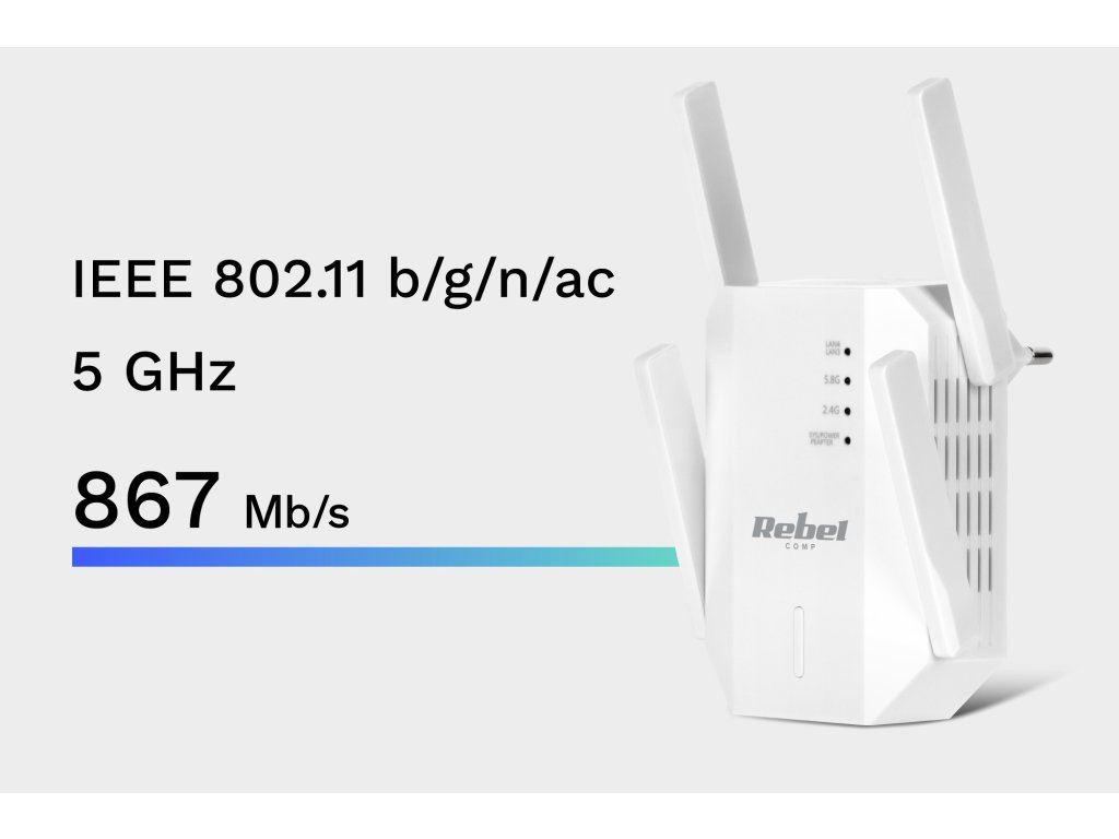 Bez ohledu na to, zda pracujete nebo relaxujete u oblíbeného seriálu, slabé internetové připojení je velký problém. Zesilovač signálu Wi-Fi Rebel podporuje standardy IEEE 802.11 b/g/n a umožňuje práci rychlostí až 300 Mb/s v pásmu 2,4 GHz a až 867 MB/s v pásmu 5 GHz. Díky tomu zvětšuje dosah bezdrátové sítě až na 100 metrů.