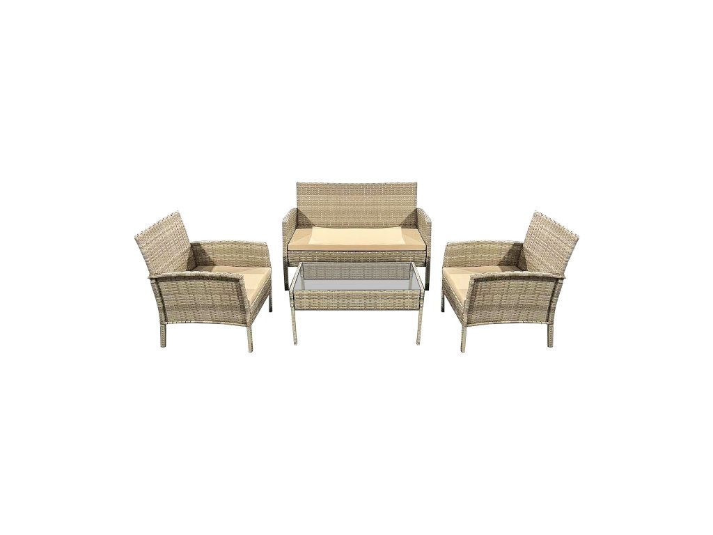 Sada obsahuje dvě křesla a pohovku vyrobené z vysoce kvalitního technoratanu. Jejich konstrukce je postavena na pevné hliníkové kostře pokryté práškovou vrstvou. Toto spojení zajišťuje trvanlivost a odolnost vůči povětrnostním podmínkám.