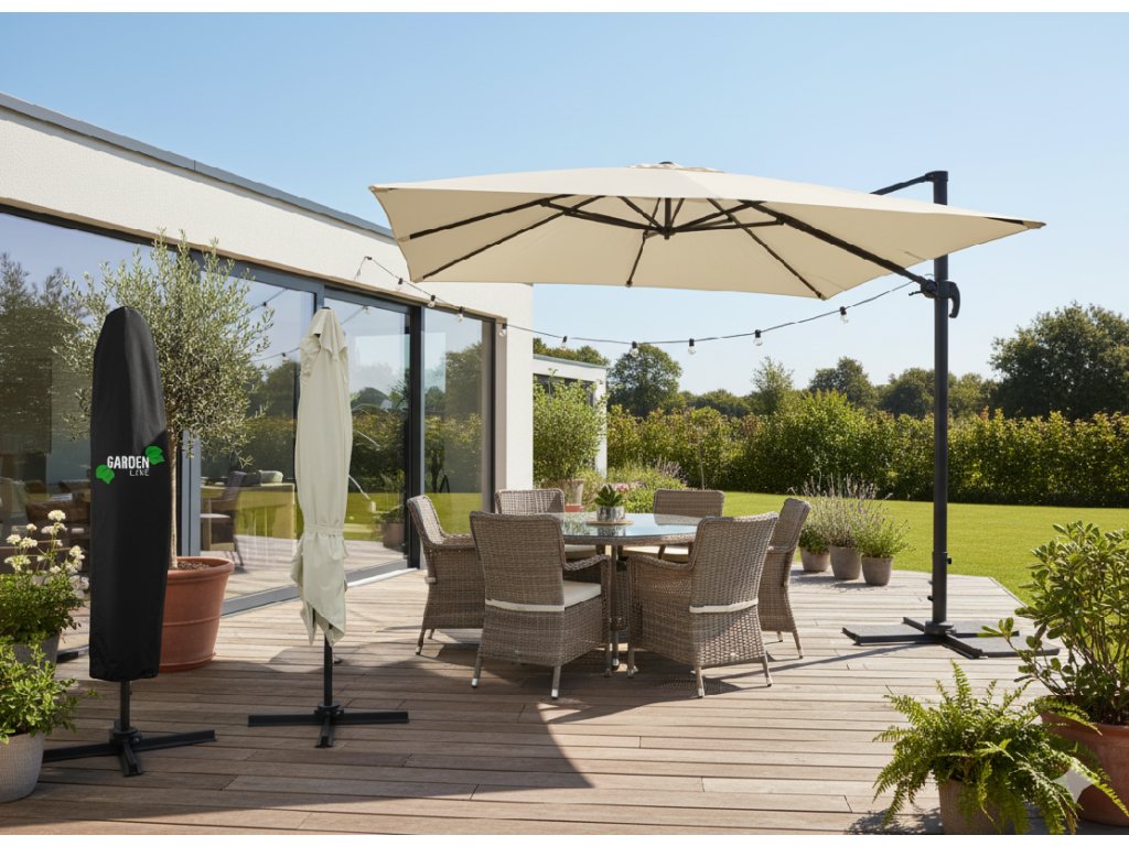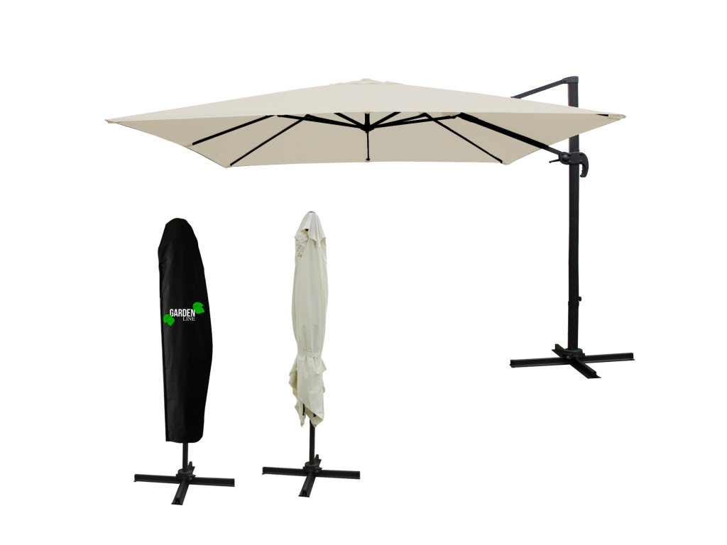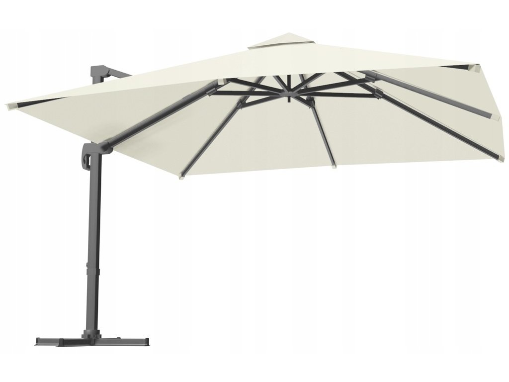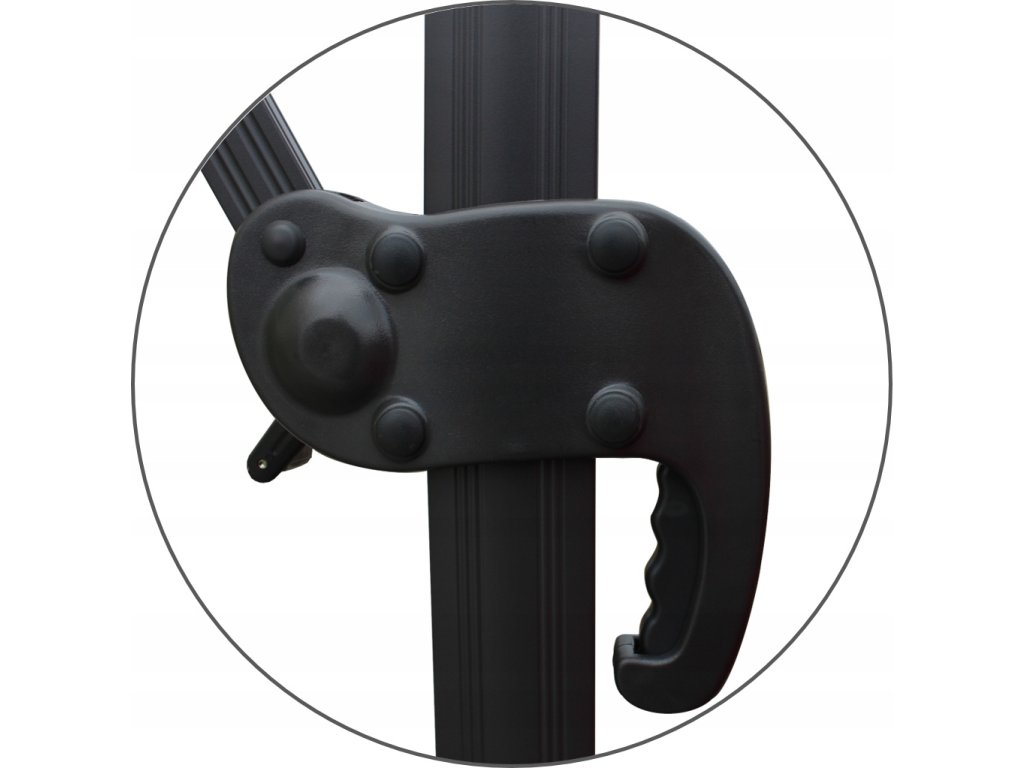 Slunečník je vyroben z vysoce kvalitního materiálu. Stříška je vyrobena z vodoodolného materiálu. Náš produkt je vybaven pevným rámem vyrobeným z práškově lakované oceli. Ve stříšce se nachází speciální ventilační otvor. Dodatečně slunečník obsahuje vodoodolný obal vyrobený z polyesteru v černé barvě.