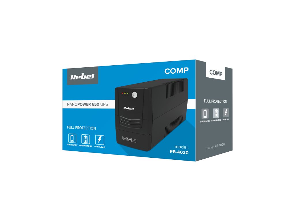 UPS Rebel je vybaven řadou ochran, které chrání připojená zařízení! Rebel Nanopower 650 má ochrany proti: vybití, přebití a přetížení.