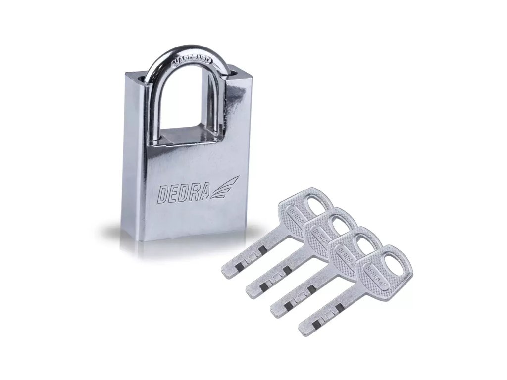 Zámek DEDRA 11U150 je solidní a praktický nástroj, kterému lze důvěřovat v ochraně cenných předmětů. V sadě spolu se zámkem jsou čtyři frézované klíče, takže případná ztráta jednoho z nich nebude představovat problém.
