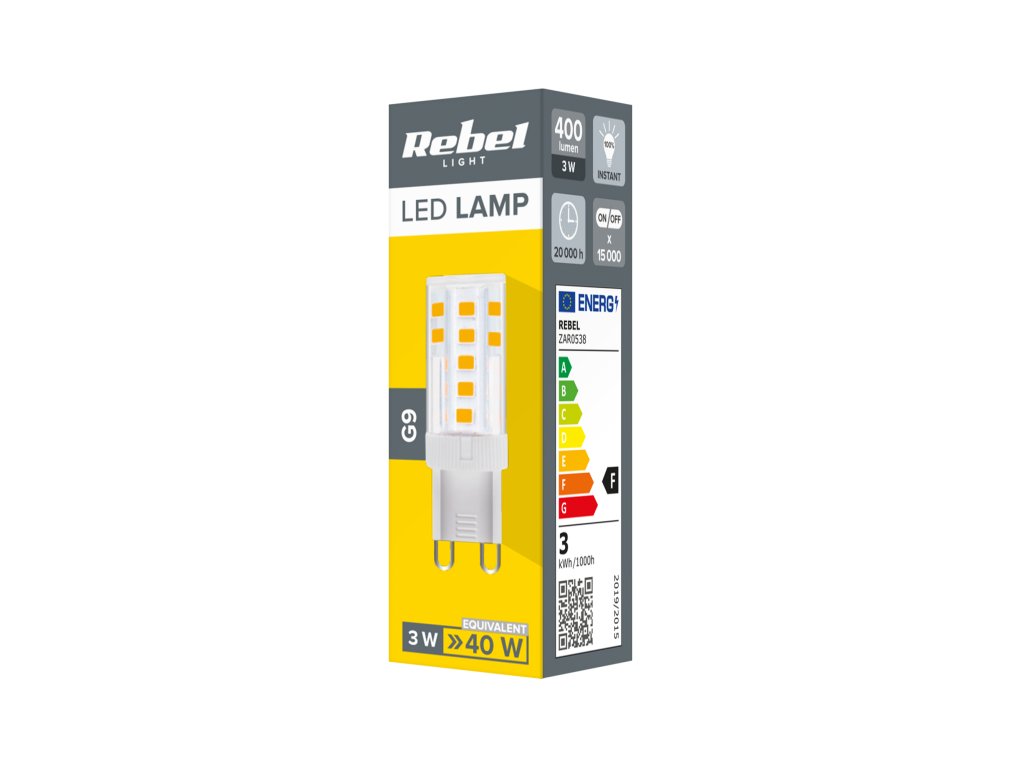 Přizpůsobení svítidlu: ---------- LED lampa Tvar: válec Patice: G9 Možnost stmívání: Ne Napětí: AC 220 - 240 V ---------- Spotřeba energie: ---------- Výkon: 3,5W Ekvivalent tradiční žárovky: 40W Faktor výkonu: >0,55 Energetická účinnost: F ---------- Vlastnosti světla: ---------- Světelný tok: 350 lm Barva světla: teplá bílá Teplota chromatičnosti: 3000 K Čas rozsvěcení: Okamžitý plný jas Úhel svícení: 360° ---------- Životnost: ---------- Počet spínacích cyklů: 15 000 Jmenovitá životnost: 15 000 h ---------- Rozměry: 16 x 49 mm Obsah rtuti: 0 mgPřizpůsobení svítidlu: