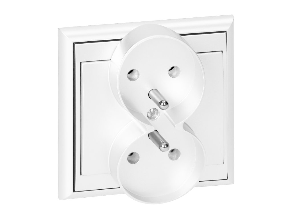 Dvojitá zásuvka francouzského typu, 2x2P+E. Navržena pro zapuštěnou montáž v systému rámové desky. Měla by být použita v interiéru (IP20).